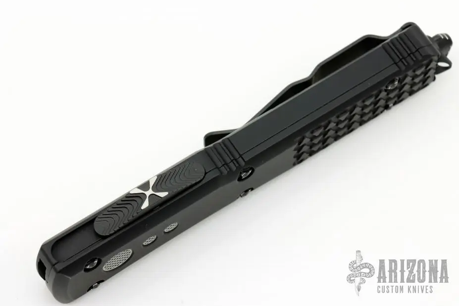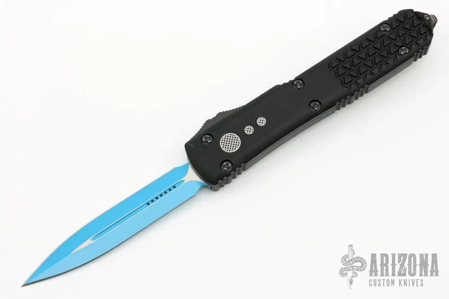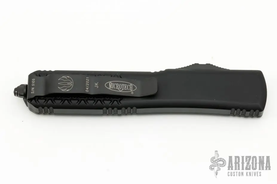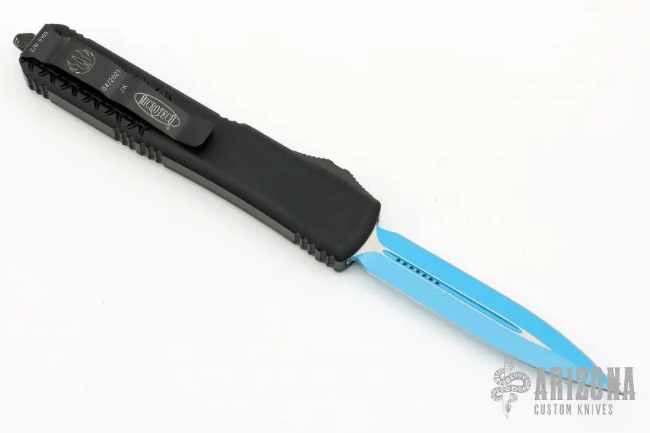 This Ultratech OTF automatic by Microtech features a D/E blue blade. Black aluminum contoured frame with black tip down stainless steel clip. Dated 04/2021 and s/n 5105. Comes with original box and papers. Â Excellent Condition. Â