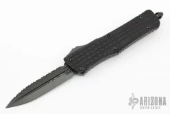 This Combat Troodon OTF automatic by Microtech knives features a double edged, DLC finished reverse full serrated blade. The handle has a DLC frag pattern aluminum handle with black hardware, tip down carry. Glass breaker. Comes with original box and papers. Excellent condition. s/n 021 dated 10/2021.