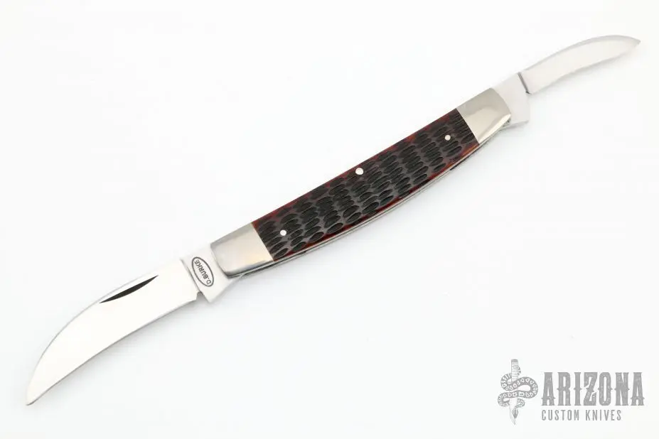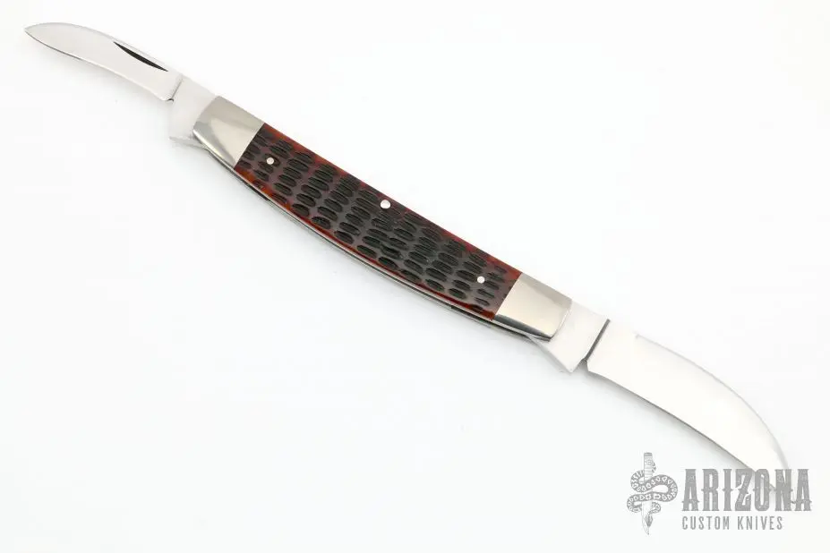 This 2-Blade Congress by Dan Burke features hand rub satin finished blades with nail nicks. The handle has stainless steel bolsters, jigged bone covers with a stainless steel liners and spring. Includes a padded zippered case. Has a couple light scratches, otherwise excellent condition.