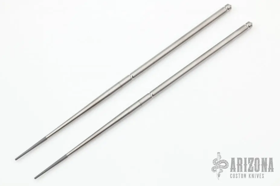 Feed yourself and your pride of ownership with these exquisitely crafted titanium chopsticks. Designed and engineered by world-renowned custom knifemaker Alan Folts and manufactured under the Foltsum™ brand, these chopsticks are beautifully crafted from solid 6AL 4V titanium stock. Their two-piece construction allows them to be conveniently carried when not in use, yet assembled in seconds thanks to a precision threaded joint. Machined in painstaking detail, they feature three different surface finishes, including a bead blasted area near the tip for a secure grip on food, a satin-finished center section, and a rich color-anodized handle section. Machined accents at the top and center add both a touch of style and a thoughtful grip texture that complements their perfect balance.Remarkably strong and lightweight, these elite eating utensils are also 100% corrosion resistant, completely food safe, hypoallergenic, and easily cleaned with ordinary soap and water. They come complete with a ballistic nylon carry pouch with dedicated pockets for all four pieces and a heavy-duty Velcro® closure.