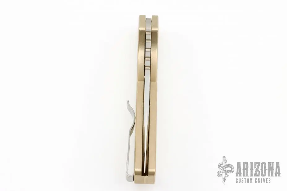 This Pro-Strider PT by Pro-Tech and Strider Knives features a Mike Irie hand ground and mirror finished blade with notched thumbrest. The handle has a tumbled aluminum bronze frame with stainless steel tip up clip. Includes the original box and papers. New from the 2023 CCKS.