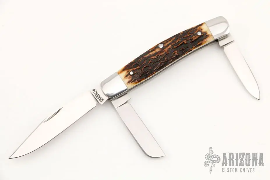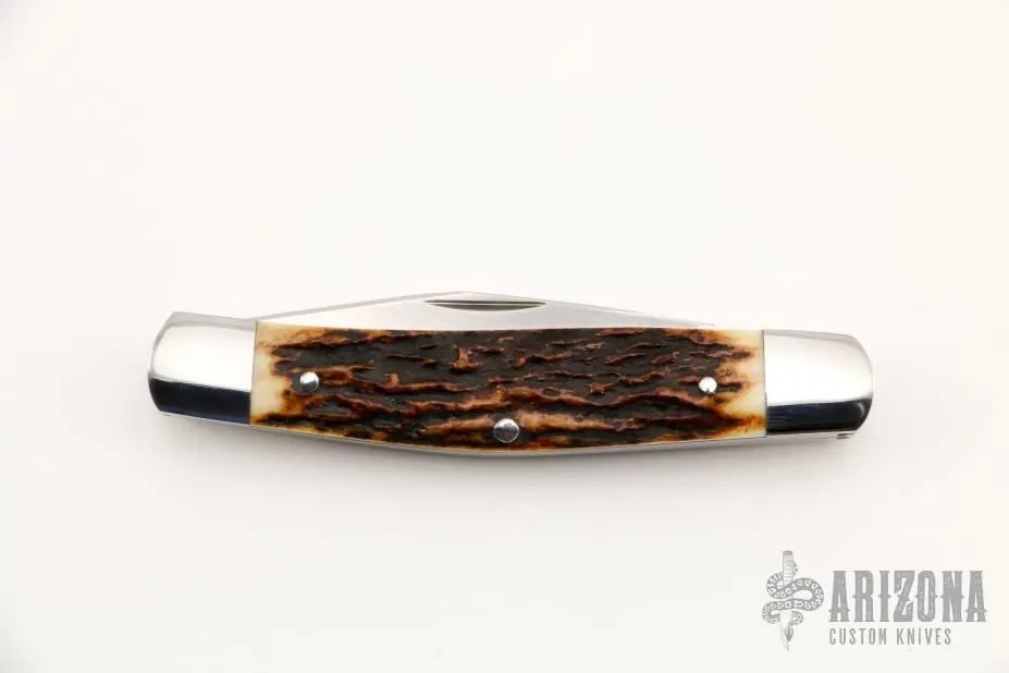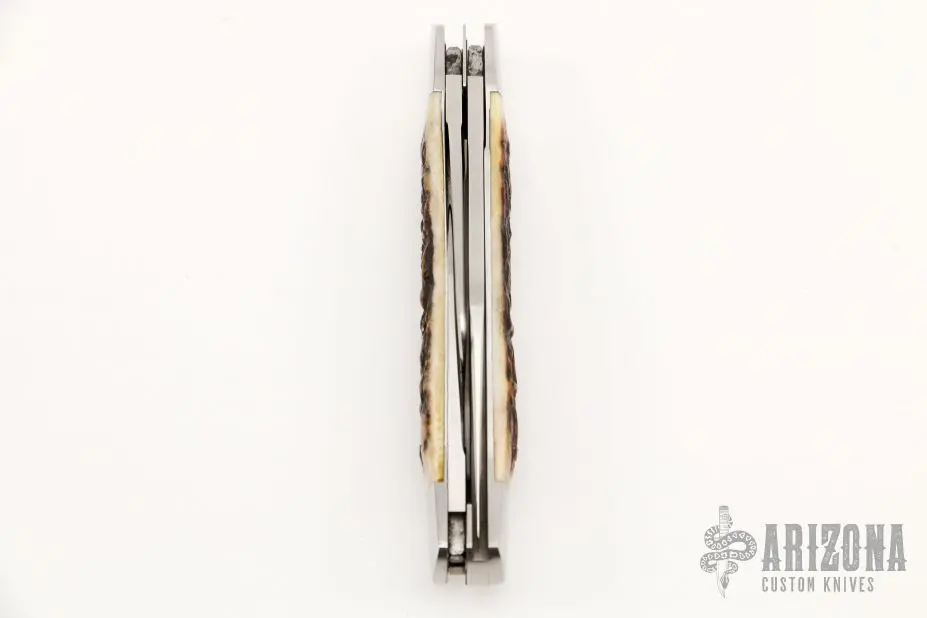 This 3-Blade Stockman by Joel Chamblin features hand rub satin finished blades with nail nicks. The handle has stainless steel bolsters with integral liners, stag covers, stainless steel springs. Comes with a zippered case. Excellent condition.