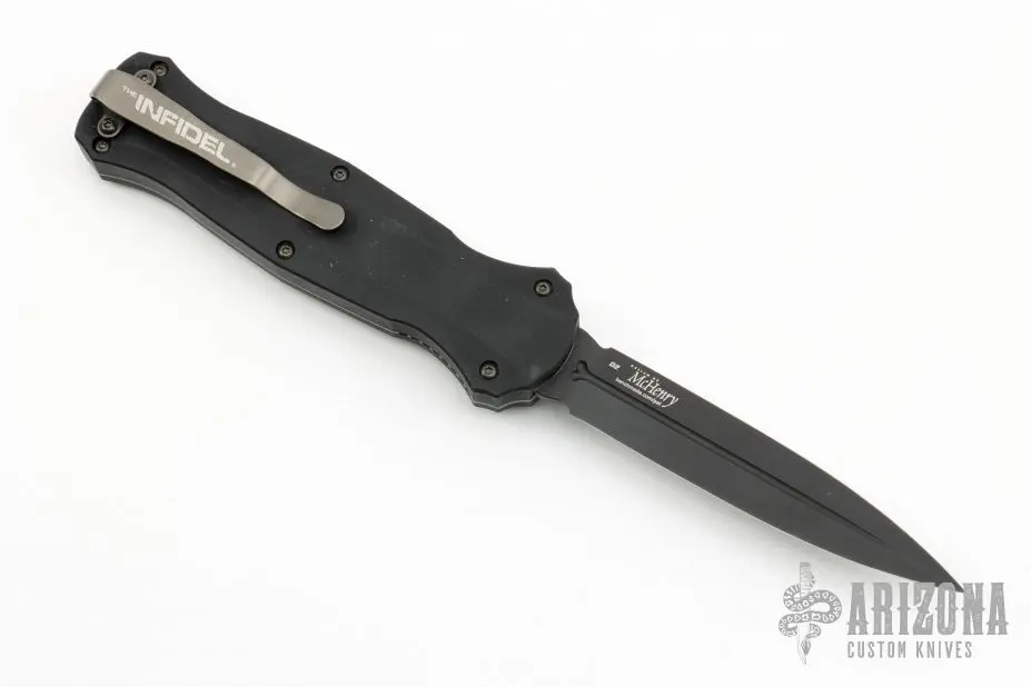 “Introducing an OTF like none-other.. The new Infidel® is rapidly making believers out of many a skeptic. Built for strength and reliability the patent pending double-action mechanics get it done over the long haul. Grab on and you will find the handle grip rock-solid with its patented machined in Presidio® style bi-directional tread pattern, and overall generous sizing for gloved hands. Intuitively pressure the release-slide forward and its spear-point edged steel fires and locks up with a unique three-point retention system with amazingly negligible blade play. Reverse the process and the blade retracts in a rapid blur of motion. The Benchmade Infidel is a special operator’s fantasy come true.”  Comes with original sheath. Has a couple light scuffs, otherwise excellent condition.Â
