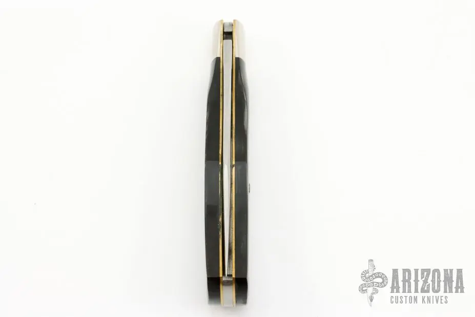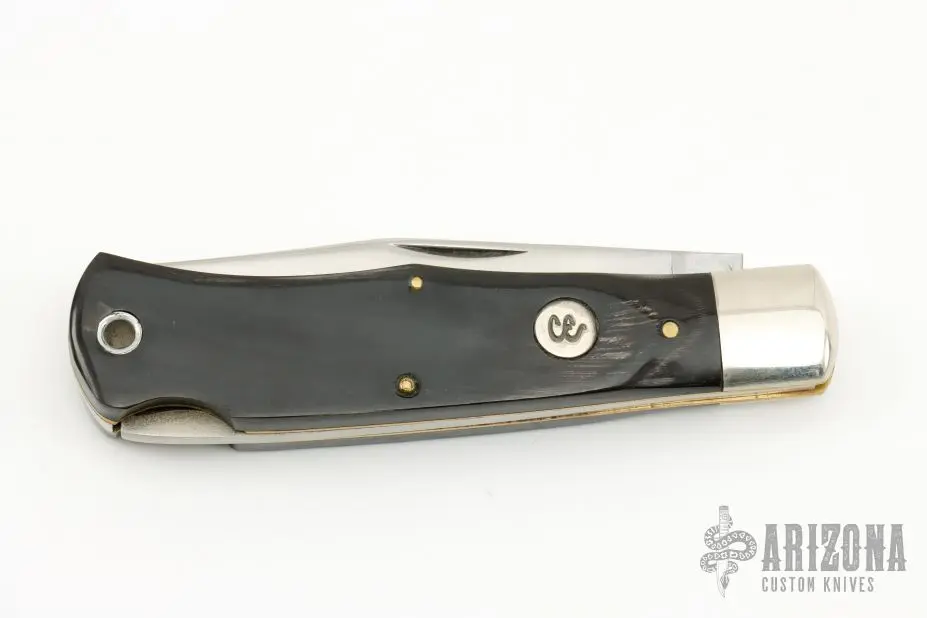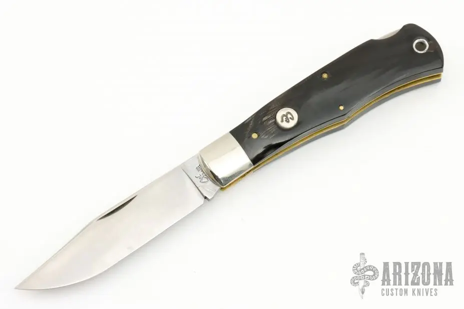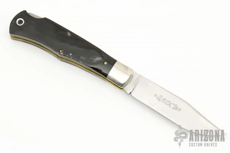 This lockback by Colonel Coon features a satin finished blade with nail nick. The handle has nickel silver bolsters, buffalo horn scales, brass liners, stainless steel spring. Has some light scratches, otherwise excellent condition.