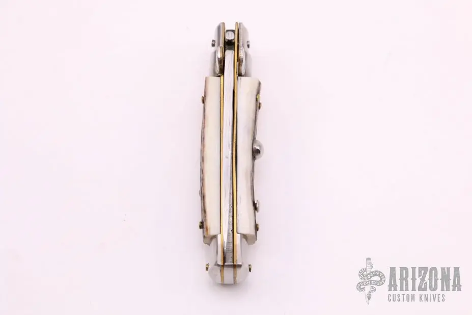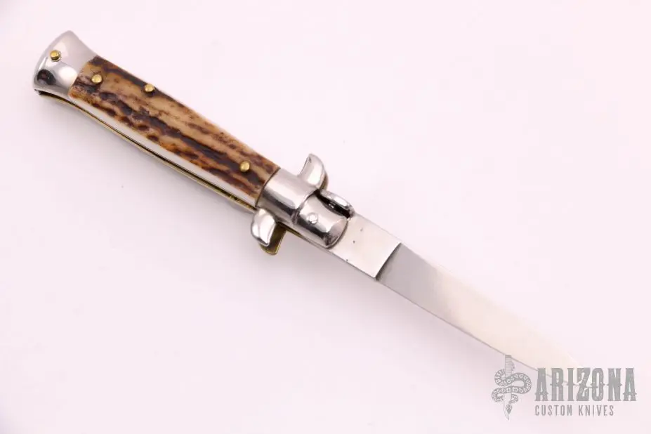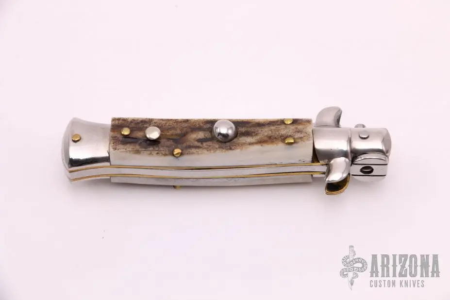 This Swivel Bolster Auto features a mirror finish spear point blade. The handle consists of nickel silver bolsters and stag scales over brass D-Stamp liners and stainless steel backspacer. Steel push button. Has a few light scratches, otherwise excellent condition.