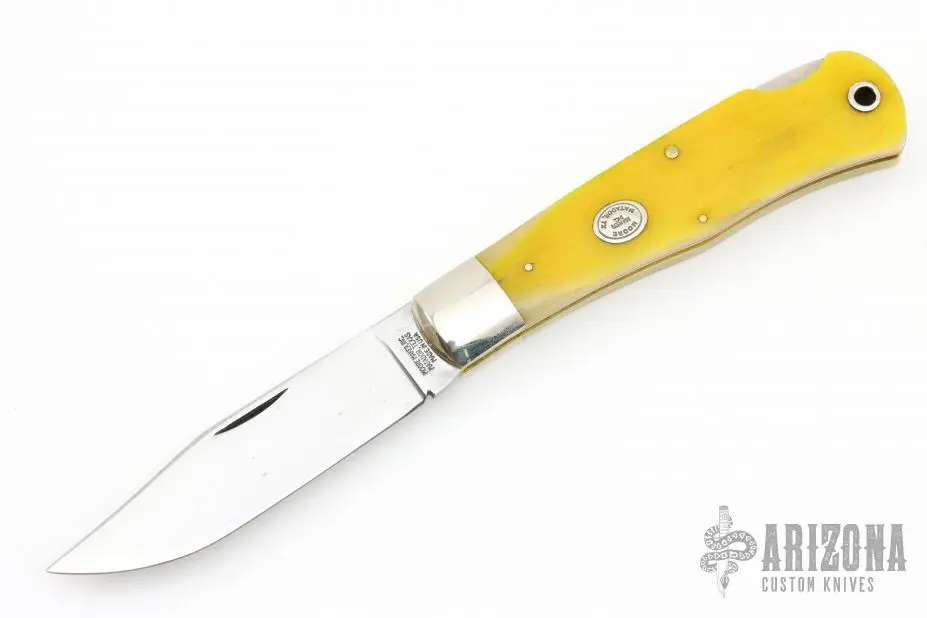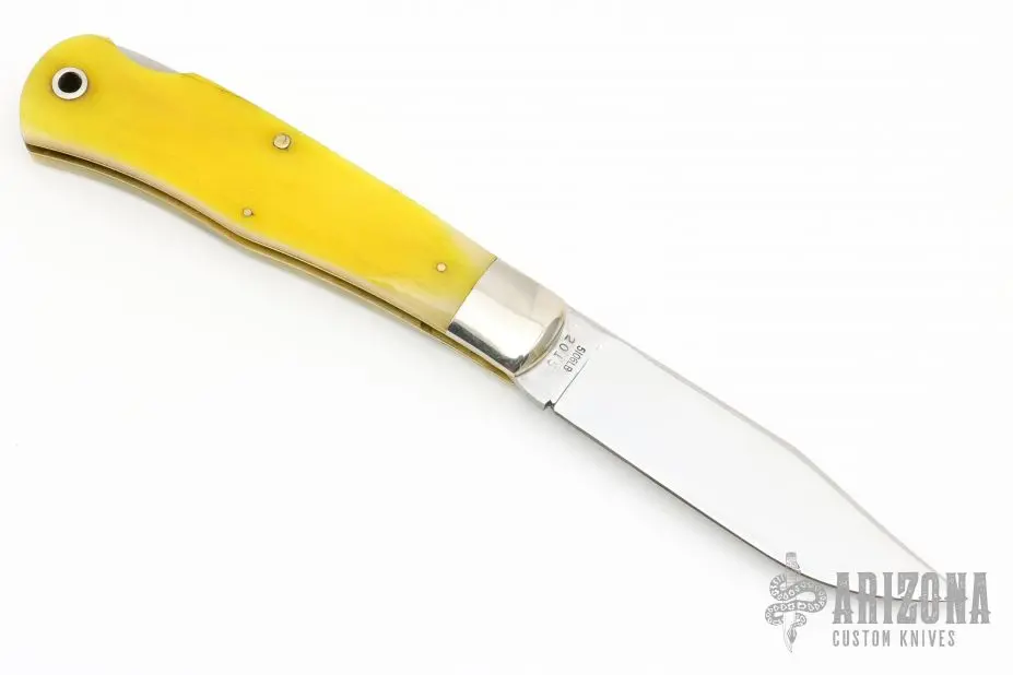 This lockback by Moore Maker features a mirror finished blade with nail nick. The handle has nickel silver bolsters, yellow bone scales, brass liners, stainless steel spring. Has some light scratches, otherwise excellent condition.