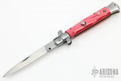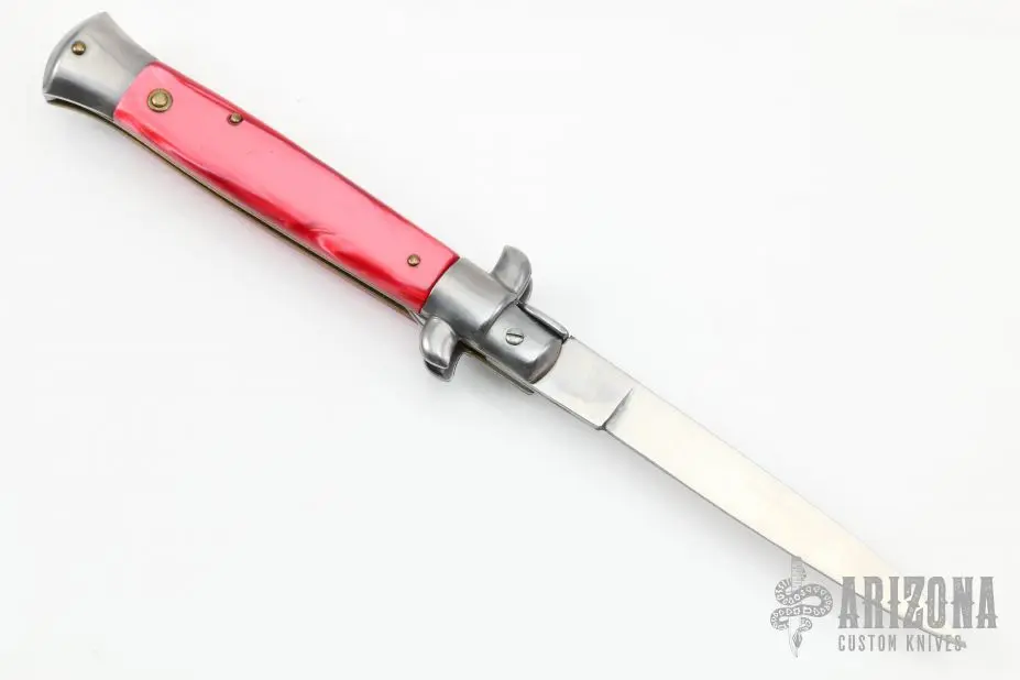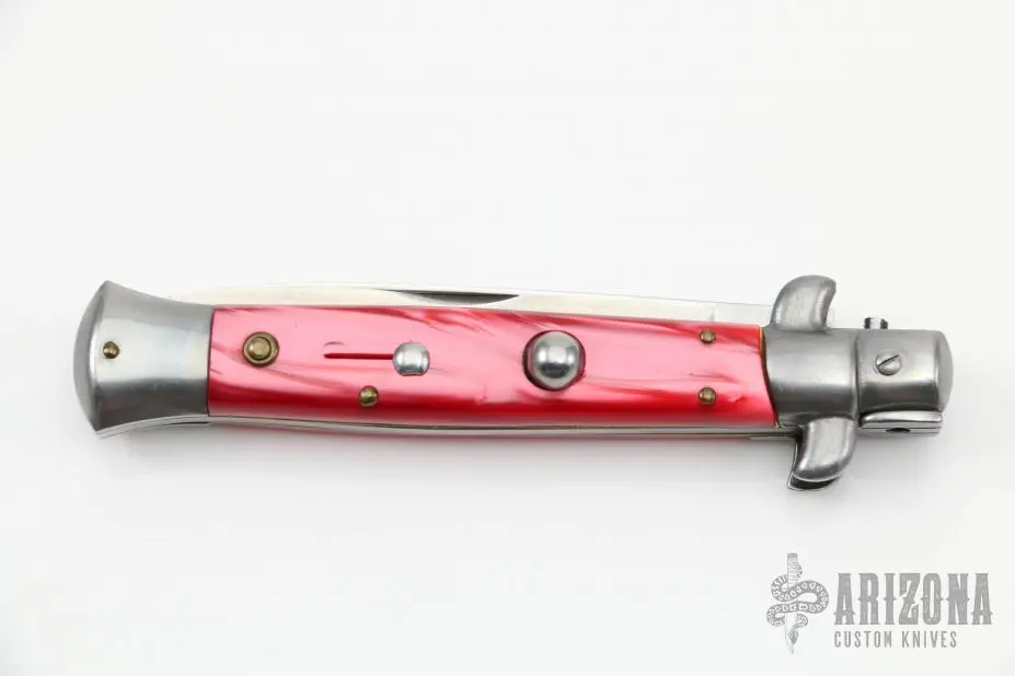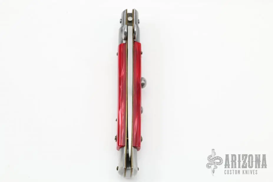 This Swivel Bolster Auto by Edgeco features a polished drop point blade with nail nick. The handle has stainless steel bolsters and butt, red scales, brass liners. Made in the 80-90s. Has some light scratches, otherwise excellent condition.