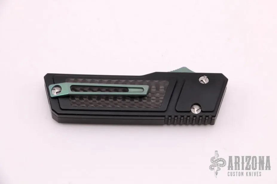 This Akuma OTF Auto by No Limit Knives features a satin finished Tanto blade. The handle has a black aluminum frame with carbon fiber inlays, tip up anodized titanium clip. Comes with a zippered case. New from maker.