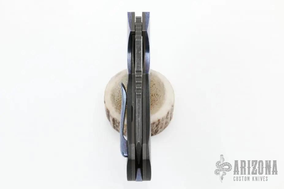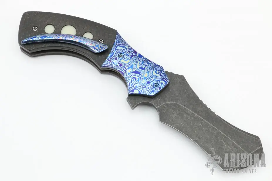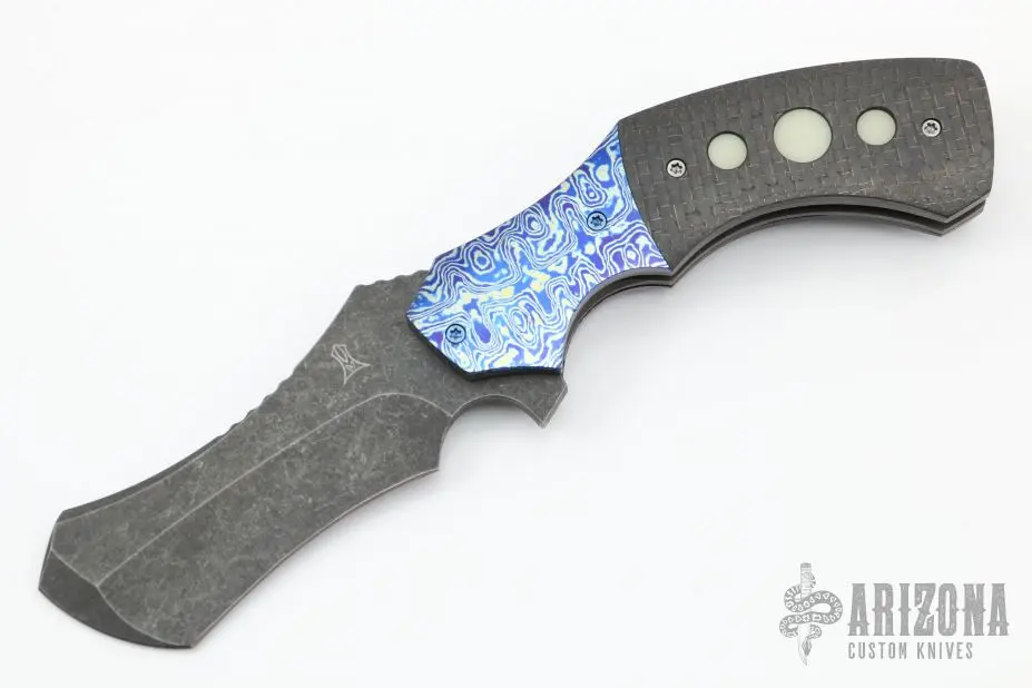This custom linerlock flipper by Jeremy Marsh features an acid tumble finished blade with sharpened front edge, notched thumbrest and flipper. The handle has white Aztec Timascus bolsters, lightning strike carbon fiber scales with moonglow inlays, white Aztec Timascus backspacer and tip up clip with hidden screws, tumbled titanium liners. Smooth and fast flipper opening that requires no wrist action. Nice detent, blade seating and lockup. Excellent condition. Comes with zippered case.