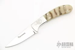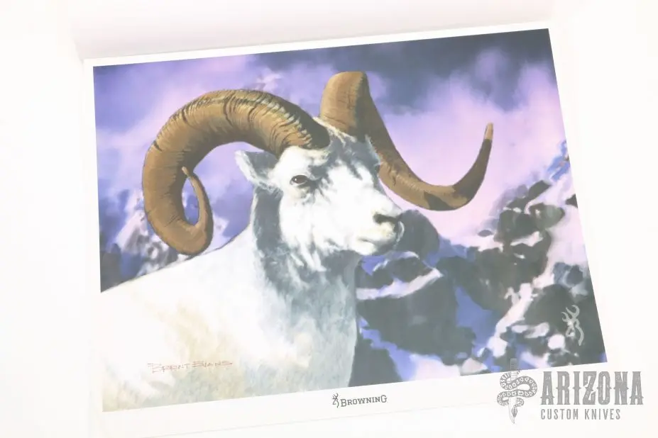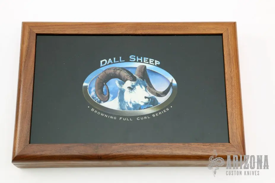 This is a limited edition Browning “Full Curl Series” knife. The knife features, dovetailed stainless steel engraved bolsters, sheep horn scales. Has a mirror polished blade with full tapered tang construction. The knife comes in a solid wood presentation box. The knife is in new, unused, excellent condition. Comes with original box and artwork.Β
