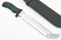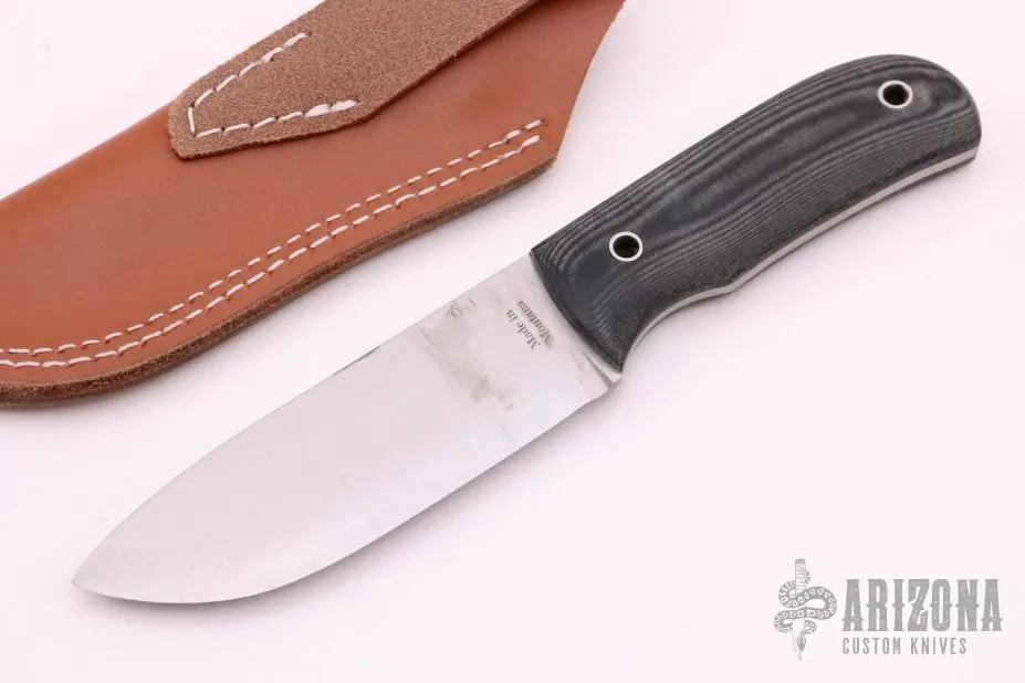 This Bushcraft Knife by Berg Knives features a satin finished scandi ground blade with .124″ blade stock and 1.385″ blade depth, full tang construction with black linen micarta scales. Comes with a brown leather sheath and original box. New from maker.