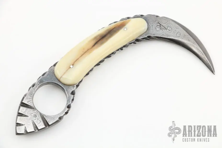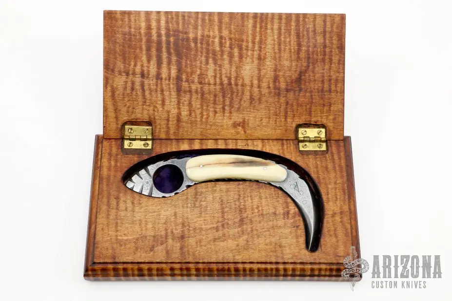 This “Claw” by Wayne Valachovic features a Damascus blade with fileworked sping and tang, .177″ blade stock and .662″ blade depth, full tang construction with mammoth ivory scales. Comes with a custom curly Tiger Oak wooden display case. Excellent condition.Β