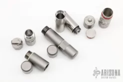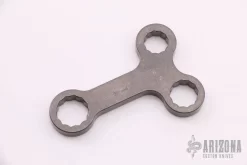 “Made of titanium, this pocket disc tool is loosely based on an antique lantern wrench design from the 1940s. Features include 1/4 and 5/16 hex openings, 3/8, 7/16, 1/2 inch wrenches, O2 cylinder wrench and 5/16 open end wrench/bottle opener.” Excellent condition. Comes with original bag and card.