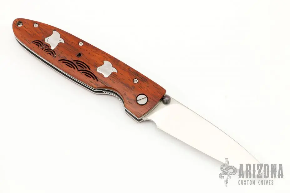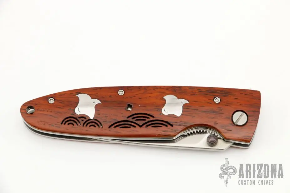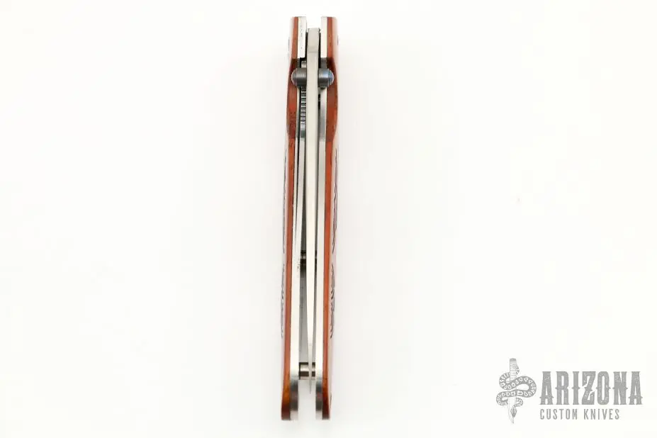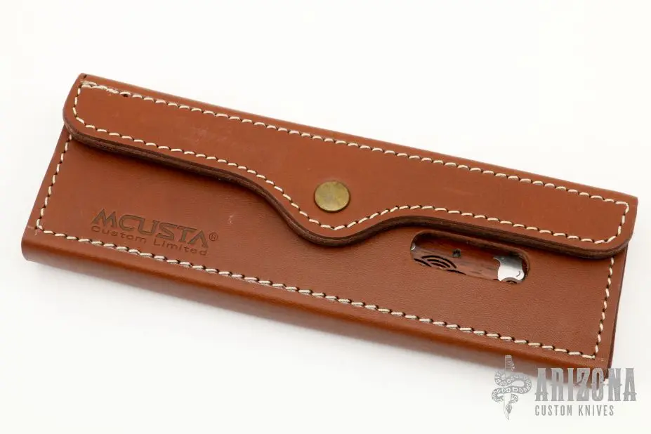 This linerlock folder by Mcusta features a VG-10 blade marked “MCUSTA, SEKI JAPAN”. The handle has cocobolo scales with stainless steel liners. Comes with original leather case. Excellent condition. #046