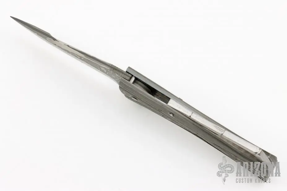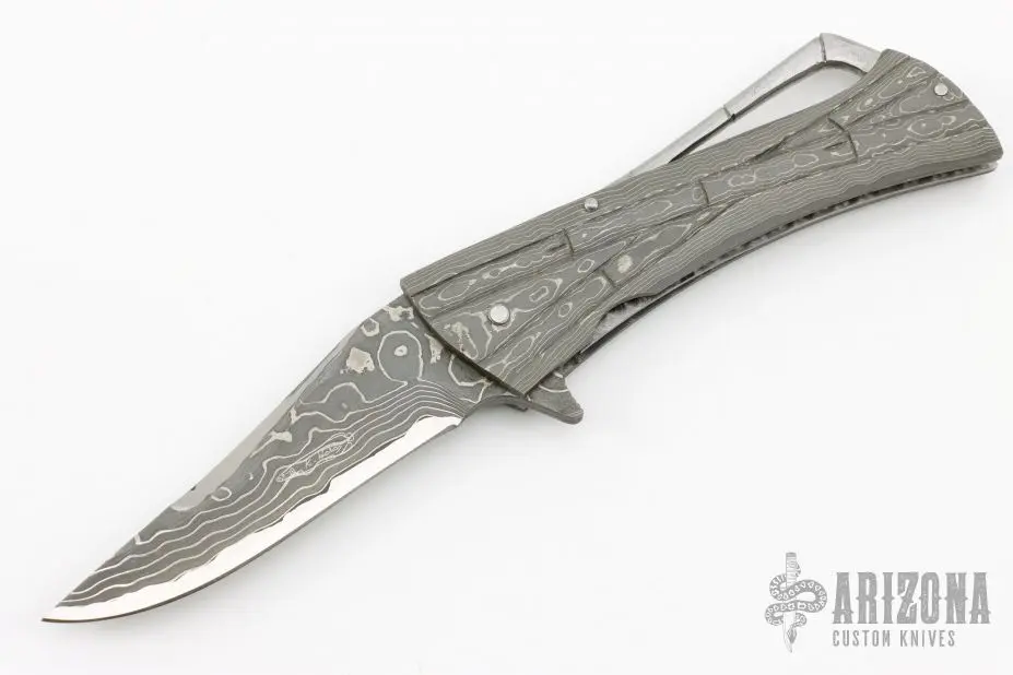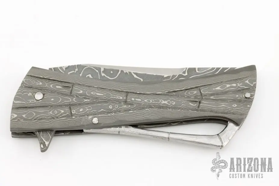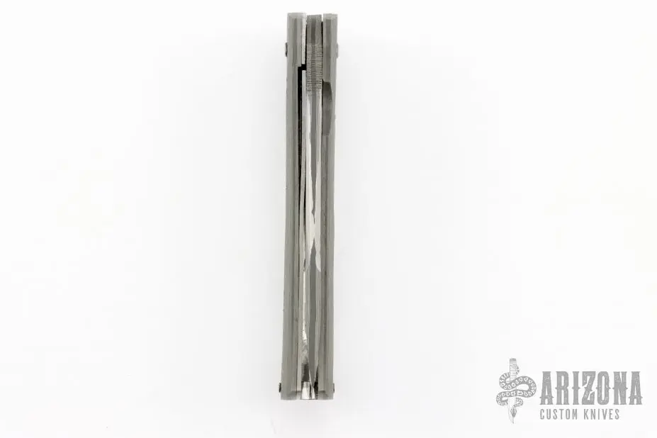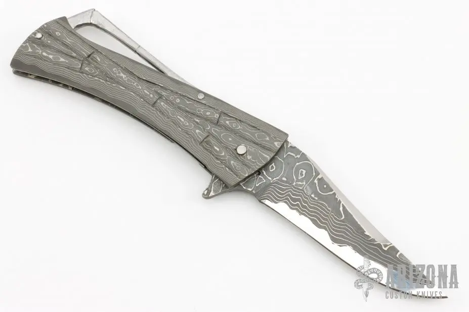 This Closer by Koji Hara features a San Mai Damascus blade with mirror polished core, notched thumbrest and flipper. The handle has a bamboo motif carved Damascus scales and stainless steel backspacer, jeweled stainless liner. Nice lockup, detent and blade seating. Comes with cloth pouch. One Off. New from maker.