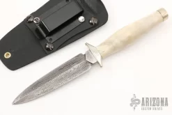 This Dagger by Barrett & Clair features a double edged Damascus blade with .117″ blade stock and .952″ blade depth, hidden tang construction. The handle has a nickel silver guard and butt with a stag grip. Comes with a kydex sheath with boot clip. Excellent condition.