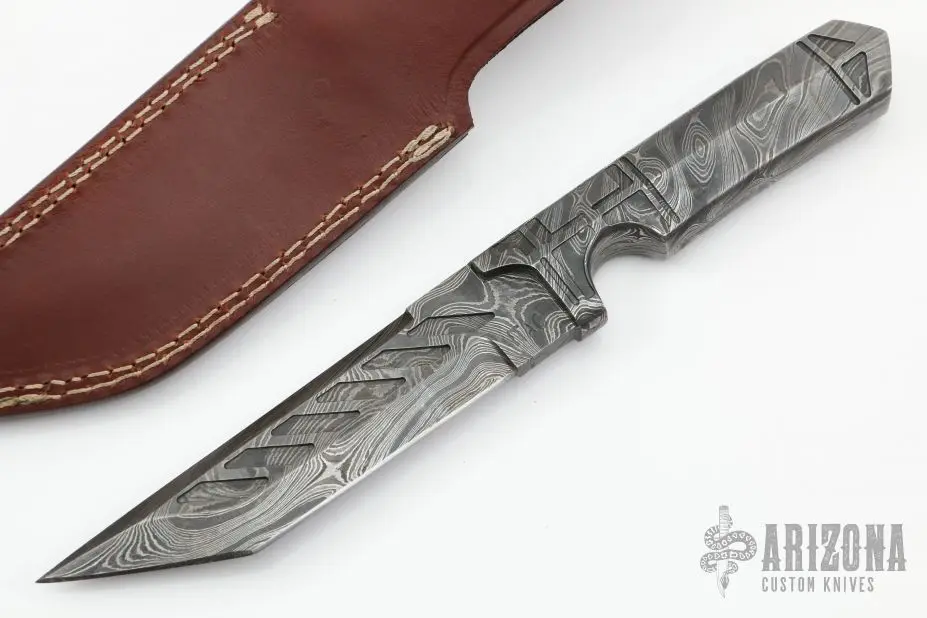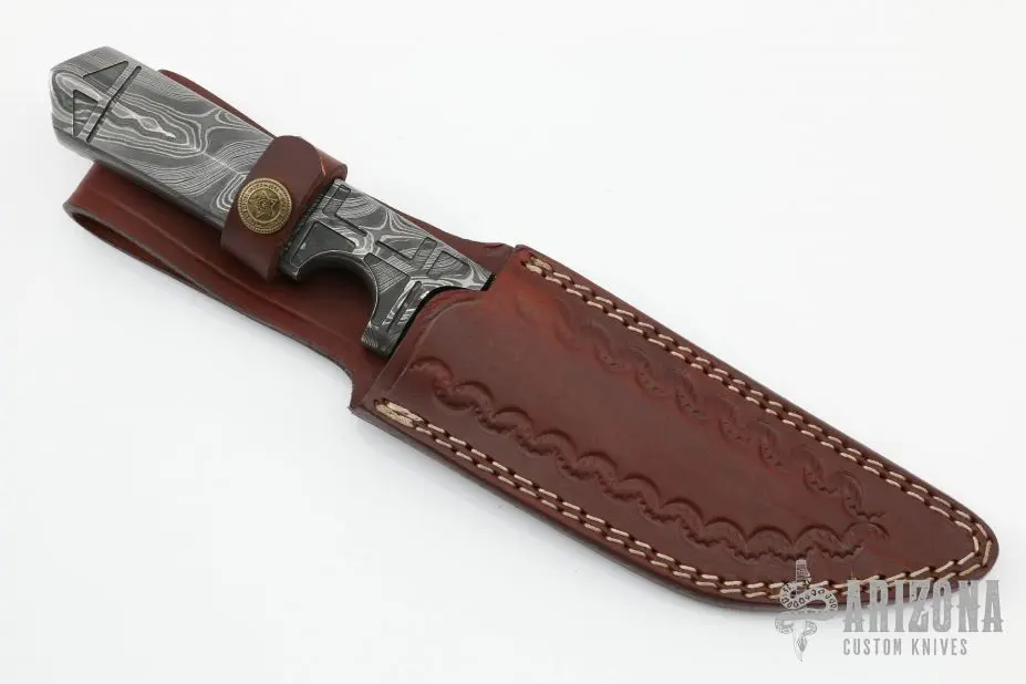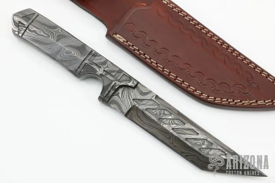 This knife by ITAC features a Damascus tanto blade with .278″ blade stock and 1.326″ blade depth, full integral construction. Comes with a leather sheath and zippered case. Excellent condition.