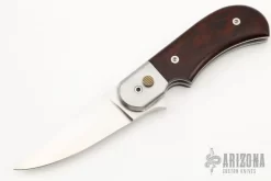 This Dead Bolt Locking Flipper by Ron Richard features a hand rub satin finished blade with flipper. The Handle has a satin finished stainless steel frame with desert ironwood scales, integral bolsters and liners. Very smooth action. Blade is centered when closed and locks up with no play when open. Has a few light scratches, otherwise excellent condition. Comes with a zippered case. Marked “RON RICHARD 1” inside backspacer