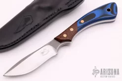 This EDC Bird and Trout by Jed Hornbeak features a satin and tumble finished blade with notched thumbrest, .178″ blade stock and .895″ blade depth, full tang construction. The handle has black/brown canvas micarta bolsters, black/blue G-10 scales with copper pins and lanyard hole. Comes with a black leather sheath with and Ulti-Clip. New from maker.
