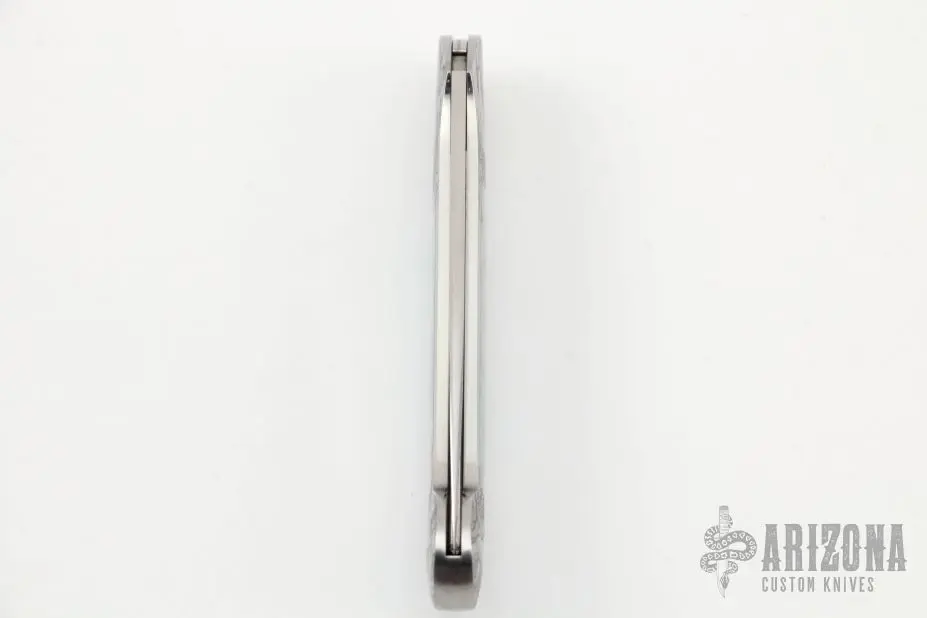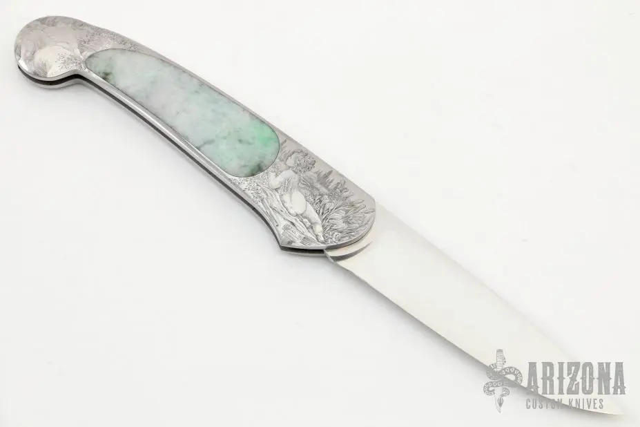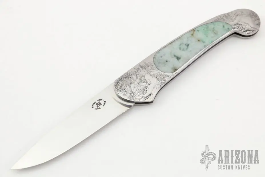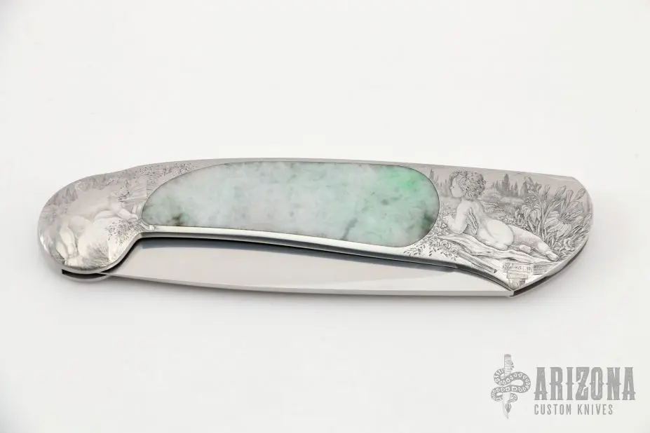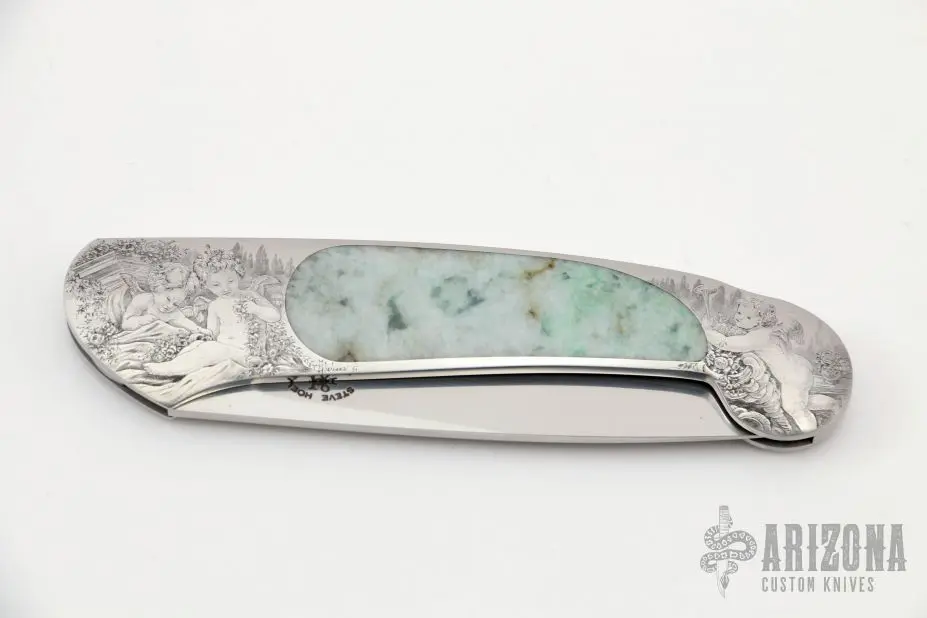 This interframe lockback by Steve Hoel features a hand rub satin finished drop point blade. The handle has an engraved stainless steel frame with light cloudy jade inlays. Nice lockup and blade seating. Very nice seamless inlays. The engraving was done by A. Galeazzi and dated ’97. Excellent condition.Β