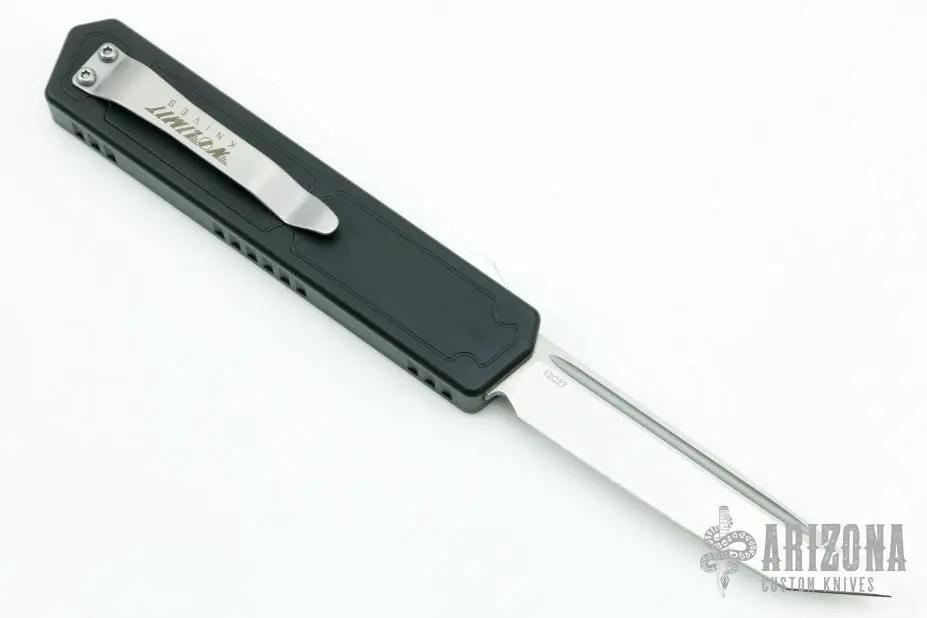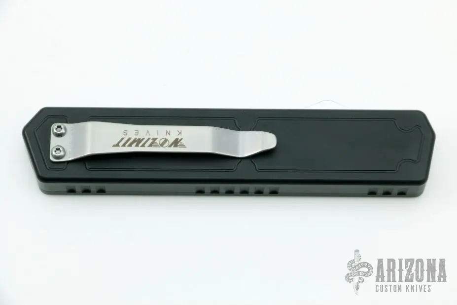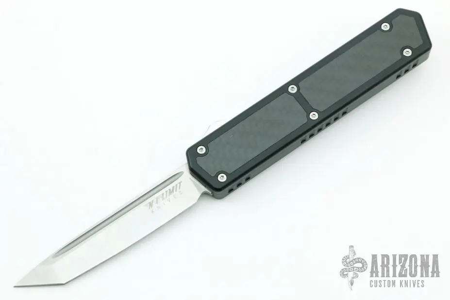 This Fer-De-Lance Black OTF Auto by No Limit Knives features a satin finished tanto blade. The handle has a black aluminum frame with carbon fiber inlays, tip down steel clip. Comes with a zippered case. New from maker.