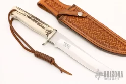 This Fighter from Jim Webb features a satin finish clip point blade with false top edge, .253″ blade stock and 1.389″ blade depth, hidden tang construction. The handle is comprised of a stainless steel double guard with black linen micarta and stainless steel spacers, black linen micarta handle and stainless steel pommel with lanyard hole over hidden tang construction. Includes padded and zippered case. Excellent condition.
