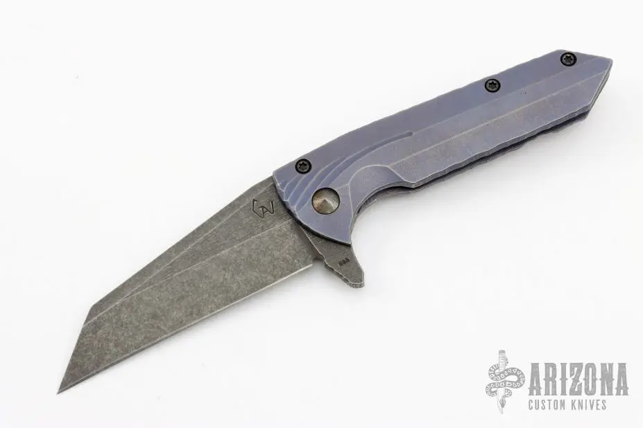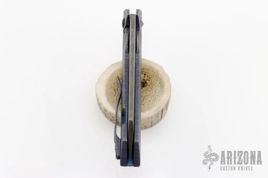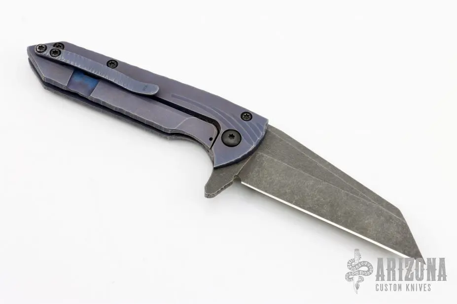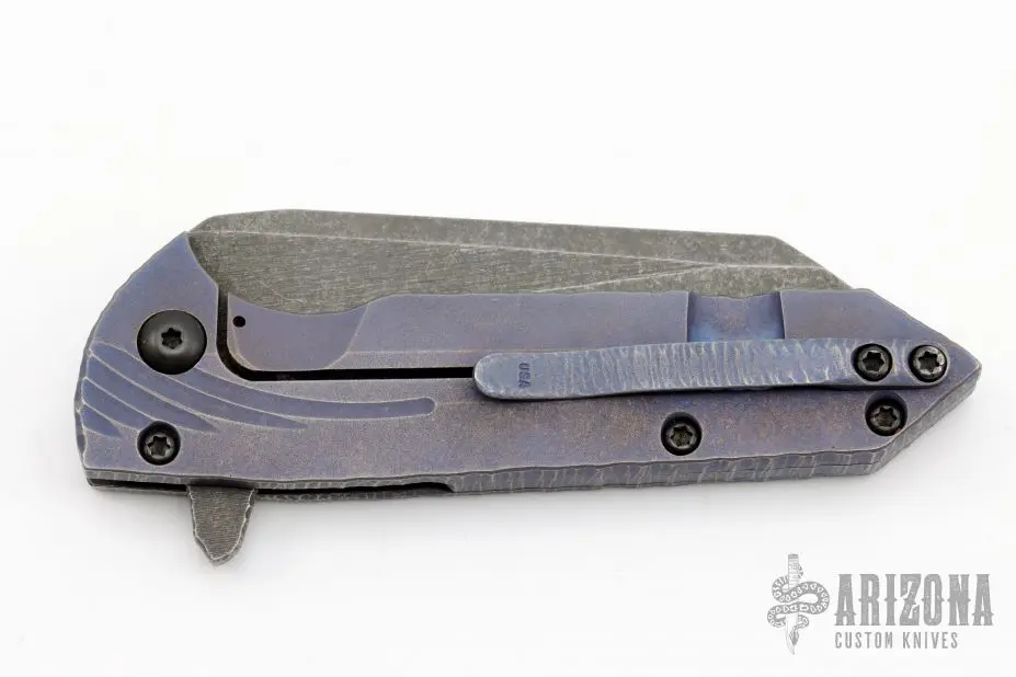 This framelock flipper from Gavko Knives features an acid wash/tumble finished blade with a flipper. The handle has milled anodize and tumble finish titanium scales and a titanium clip positioned for tip up carry. Nice detent, lockup and blade seating. Comes in a soft pouch. Excellent condition.
