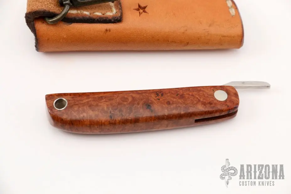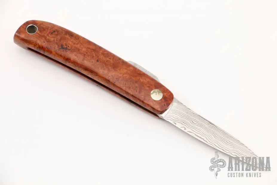 This Friction Folder by Seiji Yanagida features a VG-10 San Mai Damascus blade. The handle is one piece of Padauk Burl, lanyard hole. Comes with a leather slip sheath. Excellent condition.Β