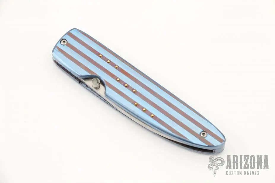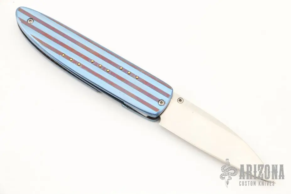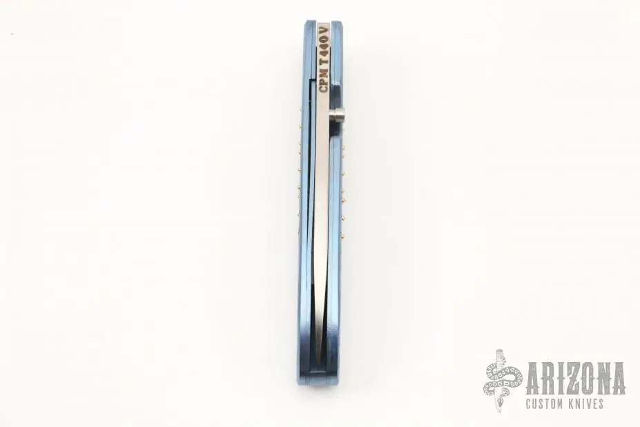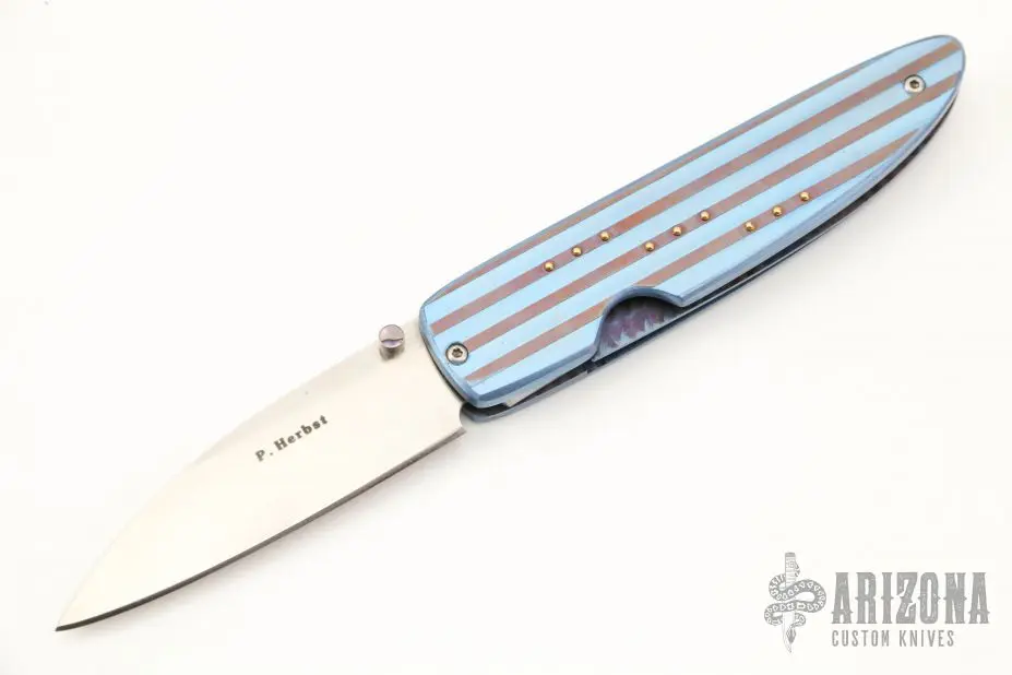 This linerlock by Peter Herbst features a hand rub satin finished blade with a single thumbstud with abalone inlay. The handle has a milled and anodized titanium frame with gold dot inlays and anodized titanium liners with jeweled interiors. Nice detent, blade is a touch off center and the lock is all the way over with a touch of play, otherwise excellent condition.Β
