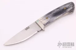 This Hunter by Dan Kendrick features a hand rub satin finished blade with .159″ blade stock and 1.105″ blade depth, full tapered tang construction. The handle has a nickel silver guard, giraffe bone scales and mosaic pins. Has some light scratches, otherwise good condition.