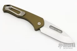 This GSD, by Liong Mah, features a satin finished blade with a notched thumbrest and flipper. The handle is composed of a orange peel finished titanium frame with carbon fiber scales and a titanium tip up pocket clip. Nice detent, lockup and blade seating. Includes a padded zippered case. Excellent condition.