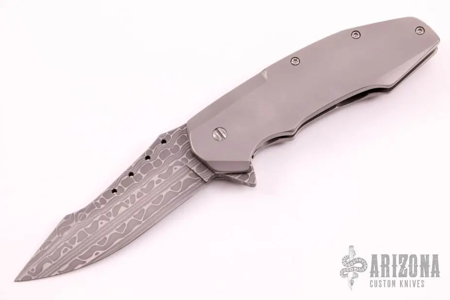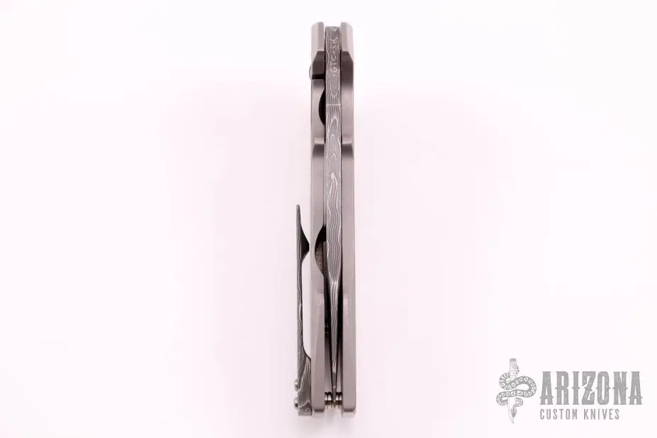 This GTC and Steven Kelly collaboration knife features a Damascus blade and flipper. The handle has a bead blasted titanium frame with Damascus pocket clip, tip up carry, and titanium barrel spacers. Nice detent, lockup and blade seating. Comes with nylon zippered case. Excellent condition.