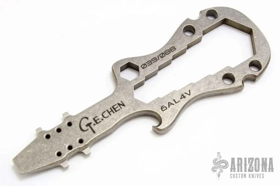 This GUITAR multitool is G.E. Chen’s first design. It’s made from 6AL4V titanium, stonewashed. This is the English version for the hex wrenches. The tooth on one side is Strider’s main screw spanner, and the tooth on the other is for the XM18. New from maker. Blade Steel: 6AL4V Titanium