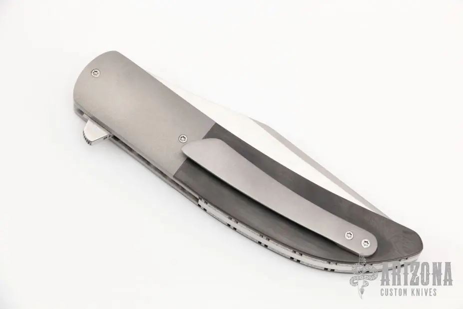 This HB20 linerlock flipper by Herucus Blomerus features a hand rub satin finished blade with polished flats and flipper. The handle has bead blasted zirconium bolsters, Chatoyant carbon fiber scales, blasted and textured titanium liners with jimping, hand rub satin finished M390 backspacer and a tip up 3D titanium clip. Blade is centered when closed, nice detent and lockup. Very smooth flipping action, rides on IKBS. Comes with velcro case and COA. New from maker.