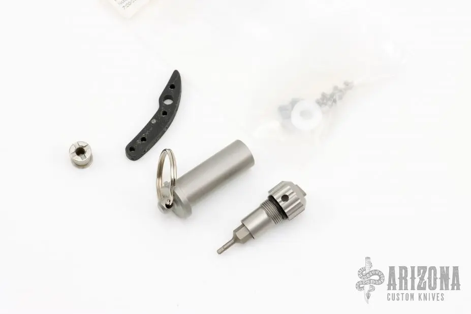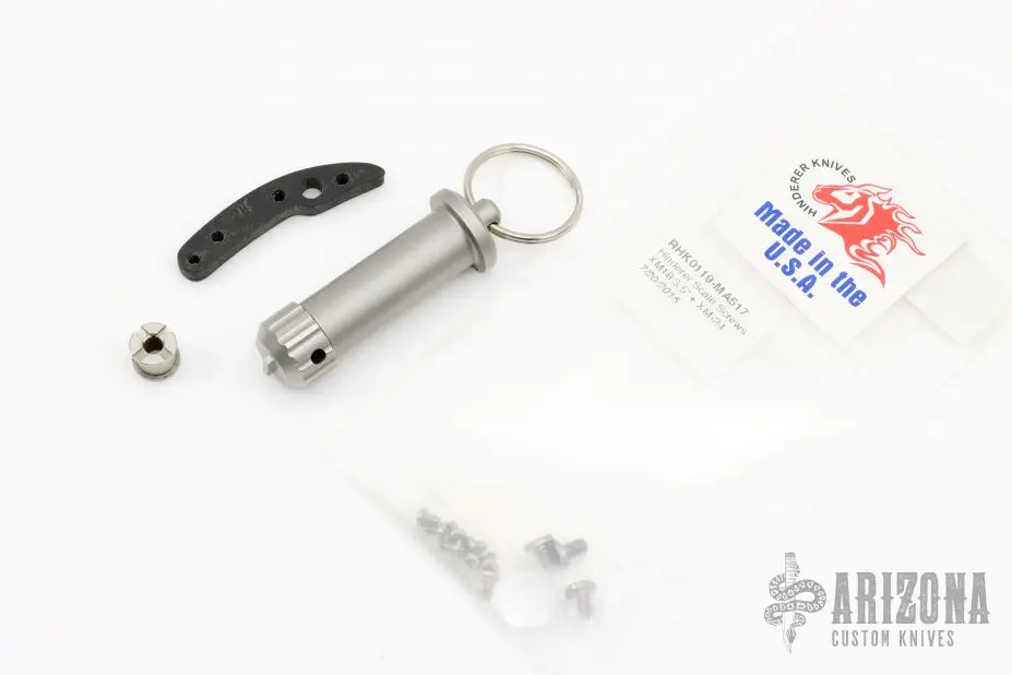 This pocket-size tool kit is a complete disassembly tool for the XM folder. It includes a built-in spanner wrench, which makes it very easy to hold both the wrench and the knife at the same time while making pivot adjustments. The head unscrews from the main body, which contains a precisely machined screwdriver blade that matches the slot on the pivot screw of the XM-18. The head will also hold any standard 1/4β³ bit. In the case of the XM-18 it is a 5/64β³ hex that works on the handle screws. The crossed drilled hole in the male end is there so you can use it as a βTβ handle for extra torque. These are made from 17-4 PH hardened stainless steel, with a bead blast finish. Comes with Extra hinderer hardware and backspacer. Excellent condition.Β