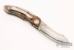 This Survival Knife by Ricardo Perpina features a blued blade with a false top edge, .196″ blade stock and 1.303″ blade depth, hidden tang construction. The handle has a blued steel guard and knurled hollow handle, matching blued steel butt cap. Comes with a black leather sheath with sharpening stone. New from maker.