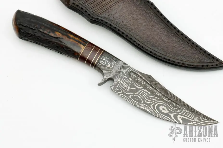 Another absolutely stunning piece from the Sobral brothers! This Hummingbird features a Damascus clip point blade with false top edge and deep fullers, .250″ blade stock and 1.510″ blade depth, hidden tang construction. The guard is integral to the blade, with a beautiful stag grip, nickel silver and canvas micarta spacers. This piece comes in an equally impressive, hand tooled, brown leather sheath and a leather zippered case. New from maker.