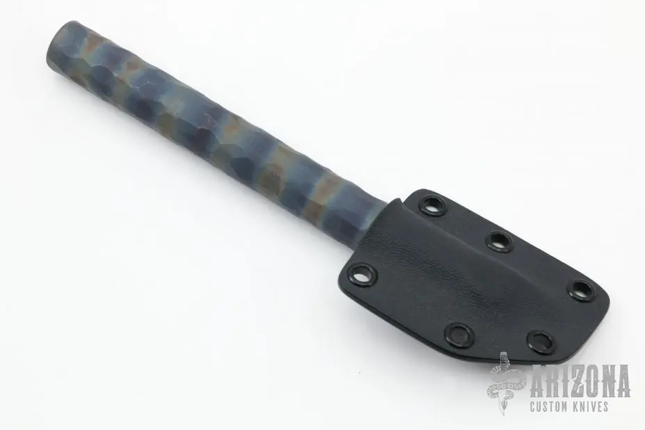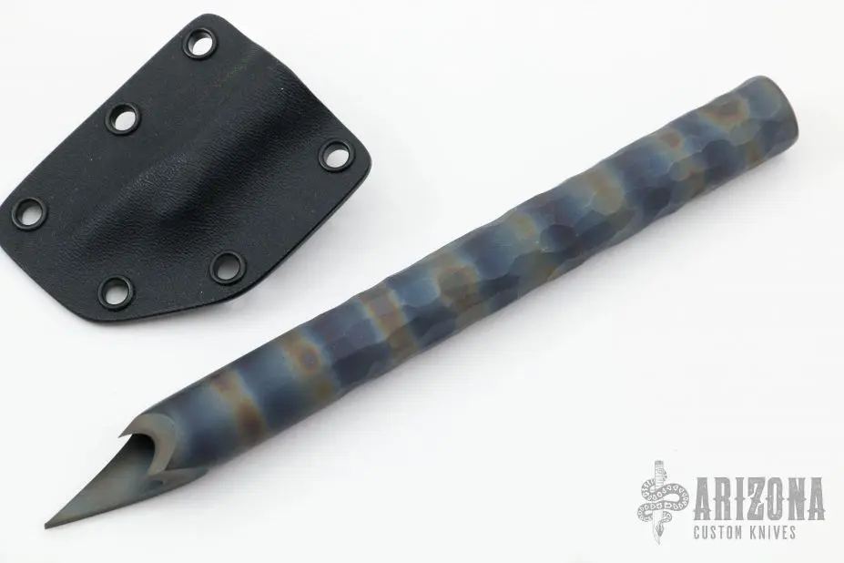 Flamed titanium “Hyperdermic Needle”. Has been flame finished and textured. Comes with a kydex sheath. Has some light scuffs, otherwise excellent condition. 3/4″ outer diameter.