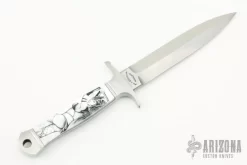 This Integral Dagger from Dietmar Kressler features a double edged hand rubbed satin finish blade with .189″ blade stock and .786″ blade depth at the ricasso. The handle is comprised of mother of pearl scales over red liners and integral construction with full tapered tang. Lanyard hole in pommel. Includes hand tooled brown leather sheath with belt loop by C. Scott and a zippered case. Excellent condition. A beautiful piece. The mother of pearl has been scrimshawed by F. Bregoli.Β