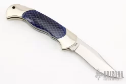 This Invaderling by TASKnives features an acid etched SuCo blade (equivalent to N690) with a notched thumbrest and false top edge, .212″ blade stock and 1.382″ blade depth, full tang construction. The handle has layered titanium scales. Comes with brown leather sheath. 60-61HRC. New from maker at the 2022 Blade Show!