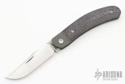 This Javelina Jack is a Sowbelly slipjoint model by Jack Wolf Knives featuring a satin finished clip point blade with nailnick. The handle has integral bead blast finish fluted titanium front bolsters and liners, fat carbon scales with a stainless spring. Comes with box, metallic tube with Sean Tiffany artwork, leather slip, sticker and microfiber cleaning cloth. New condition.