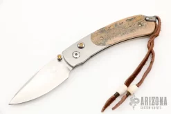 This Kestrel button lock folder was part of a limited run of 100 knives made for A.G. Russell. The knife features a hand rub satin finish blade and titanium frame with mammoth ivory scales. Citrine insets in thumb stud and button lock. Comes with original box and COA. Serial #59-0926. Includes certificate of authenticity dated November 18, 2005. Excellent condition.Β