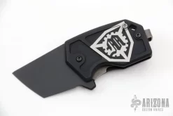 This Linerlock Flipper by Jim Smyth features a hand rubbed satin finished blade with notched thumbrest and flipper. The handle has anodized titanium bolsters, green canvas micarta scales, satin titanium liners and tip down clip, black linen micarta backspacer. Nice detent, lockup and blade seating. Excellent condition.Β