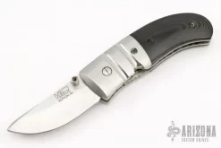 This Linerlock by Mel Pardue features a hand rub satin finished blade with single thumbstud. The handle has dovetailed and fluted stainless steel bolsters, black linen micarta scales and backspacer, titanium liners. Has some scratches, light stains on the blade, otherwise good user condition.
