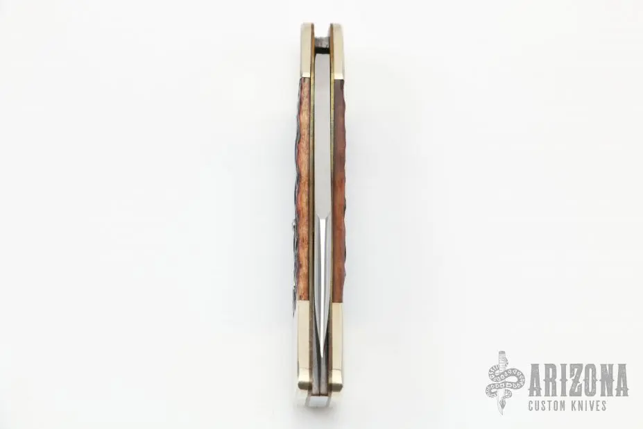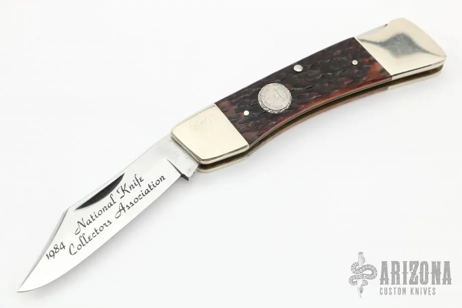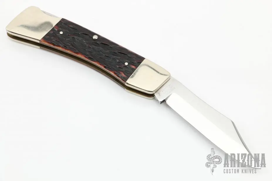 This knife features a mirror polished clip point blade with a single nail nick. The handle features nickel silver bolsters, brass liners and jigged bone scales. Includes original box. Excellent Condition.