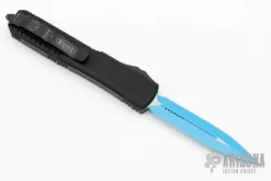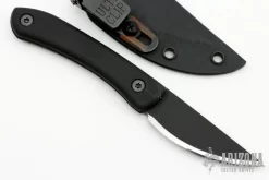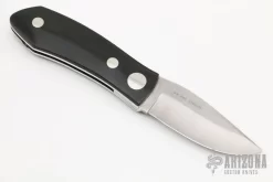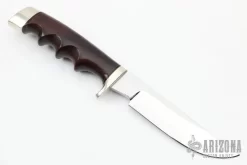 This Loveless Style Big Bear Sub-hilt by Rick Genovese features a mirror polished blade with a sharpened top edge near tip, .230″ blade stock and 1.211″ blade depth, full tapered tang construction. The handle has mirror finished stainless steel guard and sub-hilt, carbon fiber scales, lanyard hole at the butt. Excellent fit and finish. Includes a zippered case and a hand tooled brown leather sheath by C. Scott. New from maker.