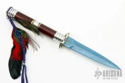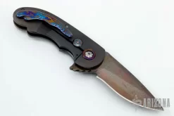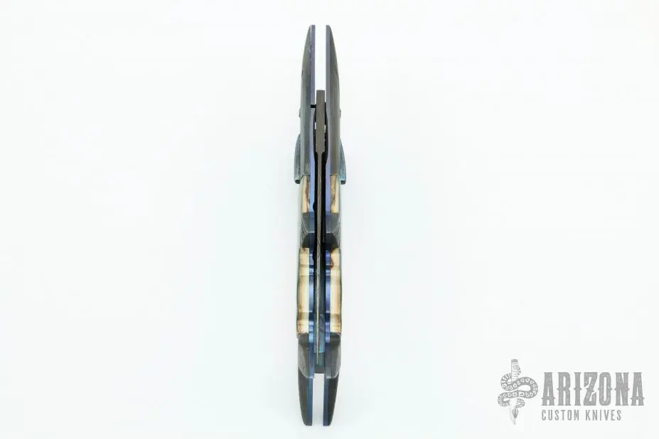 This Marlin/Swordfish Auto by Chuck Gedraitis features a Mike Norris Bent Lightning Stainless Damascus blade with false top edge. The handle has Random Pattern Damascus bolsters with carved gills, mouth and fins. One of the fins on the front bolster is the rocker bar. The scales are beautiful blue/green mammoth ivory, orange peel finished and anodized titanium liners, Damascus backspacer with filework. Nice action and lockup. Comes with a zippered case and COA. New from maker at the 2021 Blade Show. Winner of the “Best of the Rest” award. Comes with a copy of the October 2021 issue of “Blade Magazine” where it is featured on page 43.