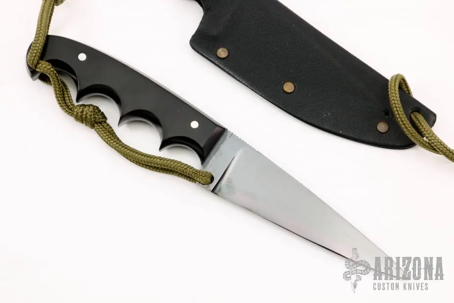 This Military Stiletto by Fred Perrin features a blued blade with notched thumbrest, .164″ blade stock and 1.183″ blade depth. The handle is comprised of black paper micarta scales with nickel silver pins over full tang construction. Includes kydex sheath. Has a few light scratches, otherwise excellent condition.