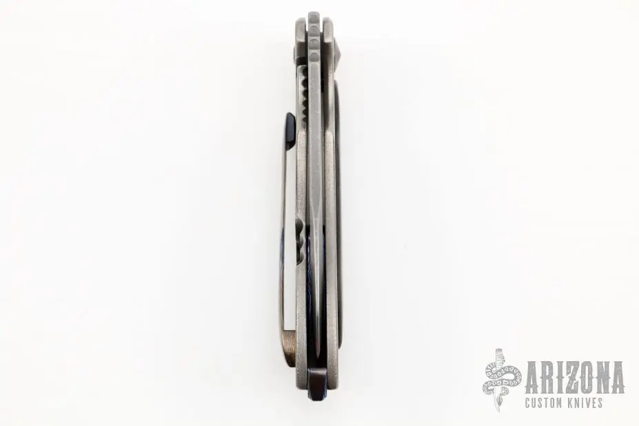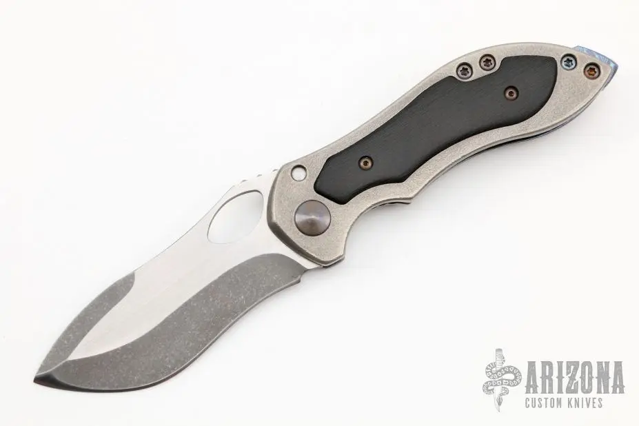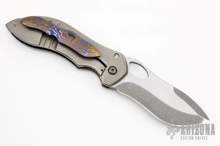 This Mini Skirmish by Neil Blackwood features a two-tone blade with notched thumbrest and thumbhole. The handle has an orange peel finished titanium frame with jeweled interior, carbon fiber inlay, MokuTi backspacer and tip up clip. Nice detent, lockup and blade seating. Comes with a nylon zippered case. Has a scratch on the clip, otherwise excellent condition.