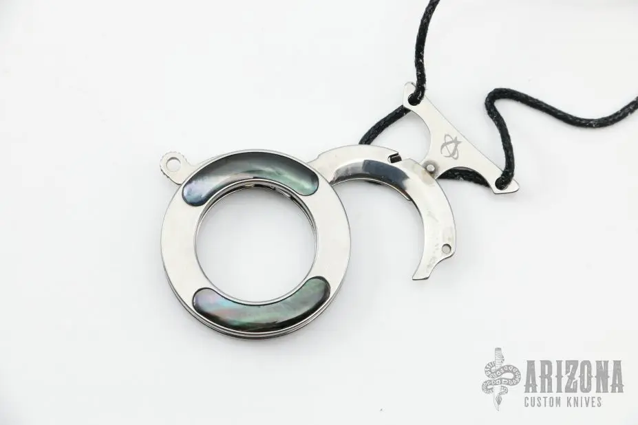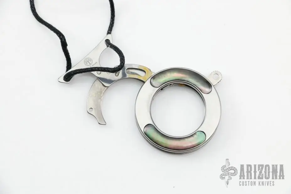 This MK-14 Vicious Circle is a Grant and Gavin Hawk design by Mantis Knives. It is circular pendant that deploys a curved blade when detached from the lanyard. Satin finish with abalone inlays. Includes original box and paperwork. Excellent condition.